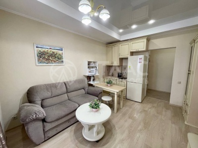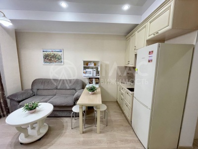 Квартира полностью меблирована: здесь есть просторная кровать с качественным матрасом, удобный раскладной диван, комод, шкаф, кухонный гарнитур, стиральная машина и два кондиционера. Также имеется балкон. Вся мебель остается для новых владельцев.