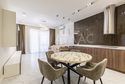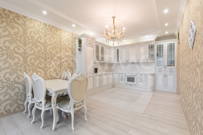 Общая площадь квартиры – 105 квадратных метров. Зонирование пространства тут на самом деле продумано в деталях, поэтому квартира будет действительно удобна для жизни и отдыха больших семей, которые ценят свободу и комфорт. В оформлении использованы дорогостоящие материалы, что подчеркивает элитный статус предложения. Установлена новая мебель и техника от всемирно известных брендов.