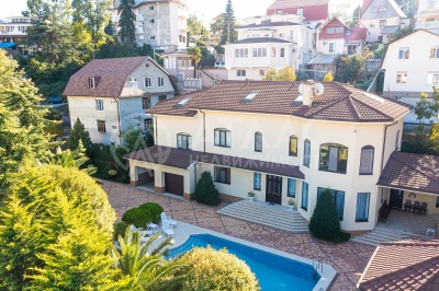 4 этажа, 640м2, 6 спален и 2 гаража. Просторная гостиная в 100м2 с высокими потолками в 6,5м, шикарной 3,5 метровой люстрой и действующим камином. Обустроенная кухня, которая переходит в просторную столовую. Бильярдная, которая плавно переходит в свой собственный бар со своей мини-кухней. Винная комната, баня и бассейн, крытая и закрытая беседки с фонтаном. Везде сделан шикарнейший классический ремонт, а мебель и техника, в большей своей части, сделаны на заказ у ведущих мировых производителей. Все коммуникации центральные. Своё газовое отопление и система климат-контроля. Продвинутая система вентиляции. 40КВ электричества.