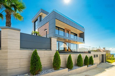 Первое впечатление производит выдающееся дизайнерское решение, кардинально выделяющее резиденцию среди всех предложений сочинского рынка недвижимости. Лаконичная геометрия фасадных элементов, эксклюзивная отделка, масштабные панорамные окна — всё это великолепие дополняется безупречно спланированным ландшафтным оформлением. Фасадная облицовка выполнена из премиальных материалов: сибирской лиственницы, природного уральского сланца и минеральных штукатурных составов.