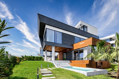 Первое впечатление производит выдающееся дизайнерское решение, кардинально выделяющее резиденцию среди всех предложений сочинского рынка недвижимости. Лаконичная геометрия фасадных элементов, эксклюзивная отделка, масштабные панорамные окна — всё это великолепие дополняется безупречно спланированным ландшафтным оформлением. Фасадная облицовка выполнена из премиальных материалов: сибирской лиственницы, природного уральского сланца и минеральных штукатурных составов.