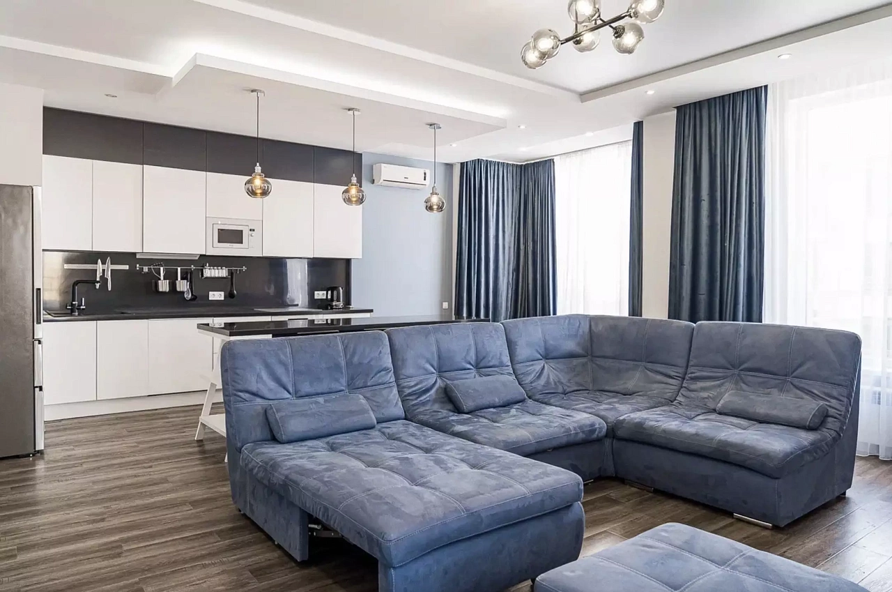 Внутри апартаментов есть гостиная зона для отдыха, полностью оборудованная кухня с микроволновой печью, стиральная машина для вашего удобства. В вашем распоряжении также собственная ванная комната с феном и тапочками для повседневного комфорта. Спальня оформлена в спокойных голубых тонах с большой двуспальной кроватью, а отдельная детская комната оборудована двумя яркими кроватями для маленьких гостей.