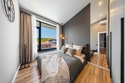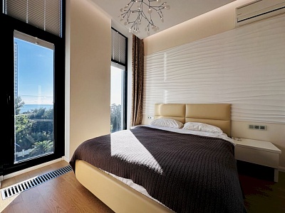 Панорамные окна открывают потрясающие виды на безмятежное море и уютный городской рельеф, превращая каждый день в впечатляющий спектакль природы и городской атмосферы. Система кондиционирования в квартире отвечает самым высоким стандартам комфорта: продуманная потолочная часть и отдельные кондиционеры в спальнях обеспечивают идеальную прохладу и комфорт в каждой комнате, даже в жаркие летние дни.