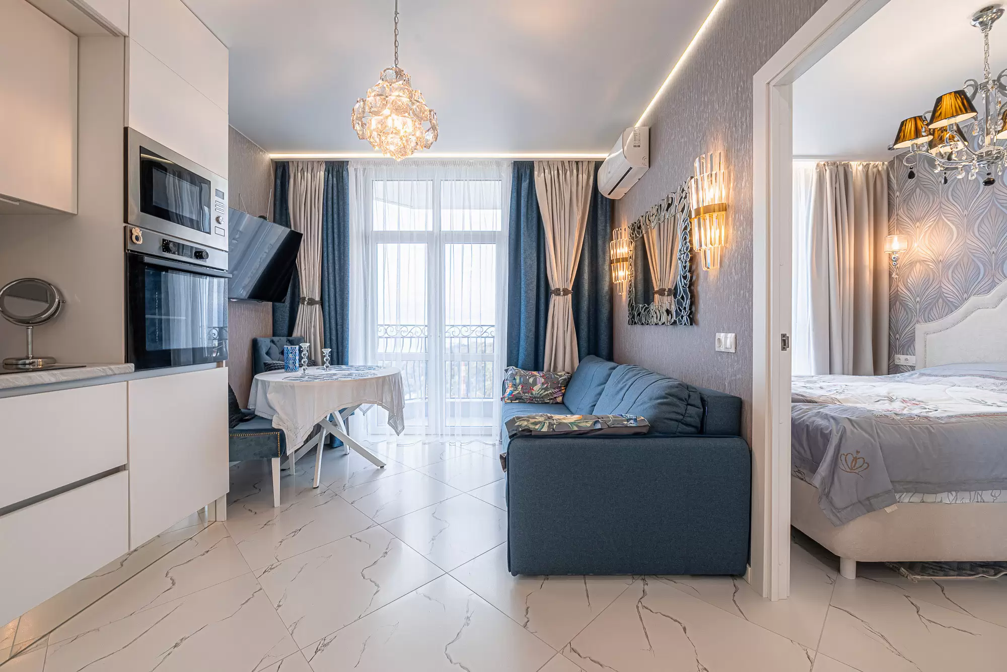 ЖК Меркато один из популярных на рынке жилых комплексов, поскольку на его территории имеются открытый бассейн, детская площадка, придомовой паркинг, подземный паркинг, продовольственные магазины, популярные пункты выдачи. Можно сказать, что данный комплекс является идеальным местом для жизни, потому, что на нем расположено все, что вам будет необходимо. Особенность данного дома - это панорамные виражные окна, вид которых выходит на самый лучший вид города, а именно на берег Черного моря. Квартира площадью 35 м2 подождет для комфортной жизни маленькой семьи, в квартире выполнен дизайнерский ремонт, установлена вся необходимая бытовая техника и мебель.