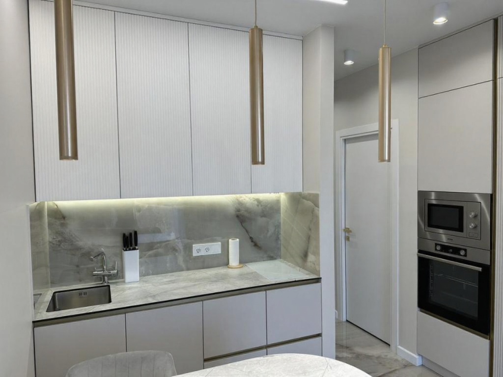 Просторная планировка включает выделенную спальню, вместительную гардеробную и большую кухню-гостиную, идеально подходящую для семейных ужинов и уютных вечеров в кругу близких. Выполнена отделка в изысканном неоклассическом стиле, сохраняющем тепло и элегантность интерьера, что создает ощущение светлого пространства и благополучия. Вы будете наслаждаться потрясающим морским пейзажем и панорамой города прямо с высоты, а мебель и бытовая техника предусмотрительно оставляют владельцам — в таком формате они уходят вместе с объектом, как на снимках.