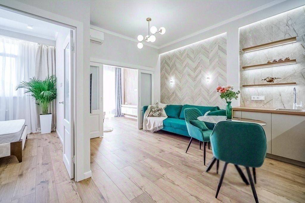 Светлая и просторная кухня-гостиная с выходом на балкон создает атмосферу уюта и тепла. Интерьер оформлен в современном стиле с акцентом на высококачественные материалы, что подчеркивает элегантность и изысканность каждого элемента.