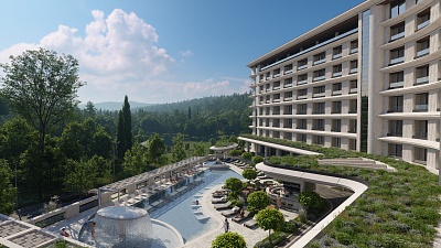 На территории более 10 ГА будут расположены крытые и открытые круглогодичные бассейны общей площадью более 1200 м2, один из которых имеет выплывную функцию прямо из СПА площадью 3200 м2 с различными видами саун, а именно: финская, дровяная, хаммам, соляная и травяная. Wellnes центр площадью 1000 м2 с направлением медицины.
