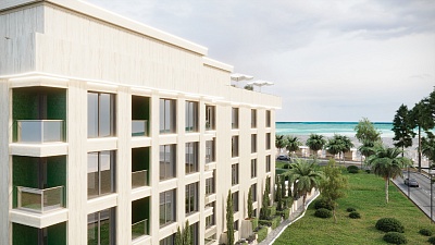 ЖК «Море» выполнен в современном архитектурном стиле, который идеально вписывается в природный ландшафт побережья. Отделка корпусов выполнена натуральным белым турецким камнем известняком - это элегантное и