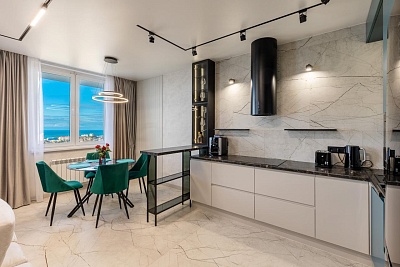 В этой квартире сделан свежий ремонт высокого качества. Планировка включает в себя две уютные спальни, две ванные комнаты, гардеробную и просторную кухню-гостиную. Все комнаты оборудованы панорамными окнами, из которых открывается великолепный вид на море и парк Дендрарий.