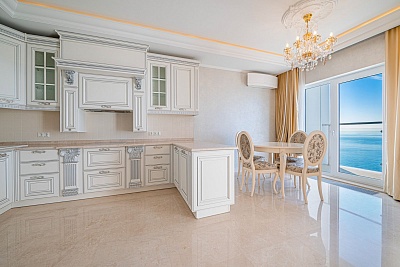 При входе в апартамент вы ощутите атмосферу роскоши и изысканности. Просторная кухня-гостиная с панорамными окнами позволяет наслаждаться захватывающим видом на море прямо из вашего дома. Это идеальное место для приготовления вкусных блюд и встреч с близкими и друзьями.