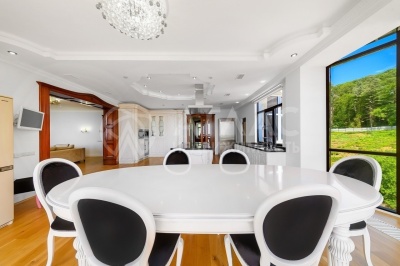 Кухня-столовая отделена от гостиной стеклянными раздвижными дверьми, что создает атмосферу интимности. Изысканный интерьер кухни с качественной столешницей и современными бытовыми приборами будет радовать вас своей функциональностью и красотой.